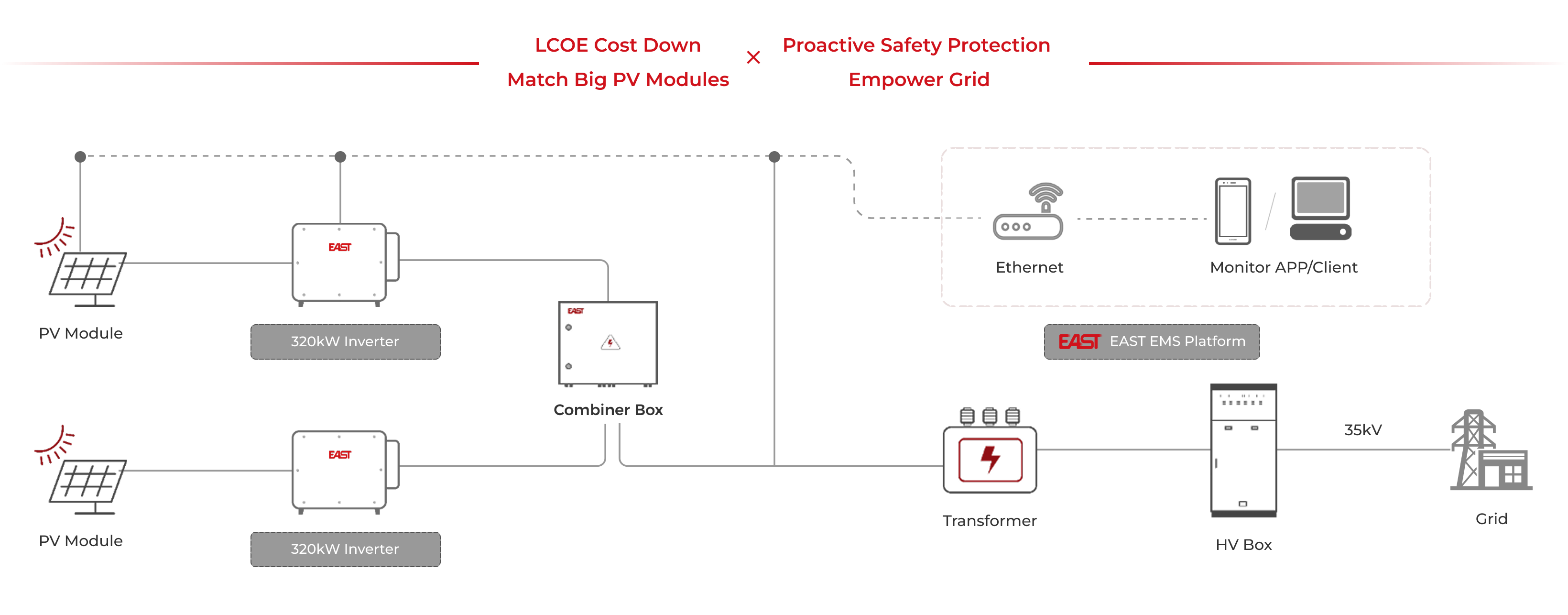 EAST large-scale PV power station solution utilizes 300kW+ high-power string inverters as the core equipment. Leveraging profound technical expertise, the system delivers higher performance, enhanced reliability, and lower Levelized Cost of Energy (LCOE), providing the driving force for the power station's full lifecycle revenue.