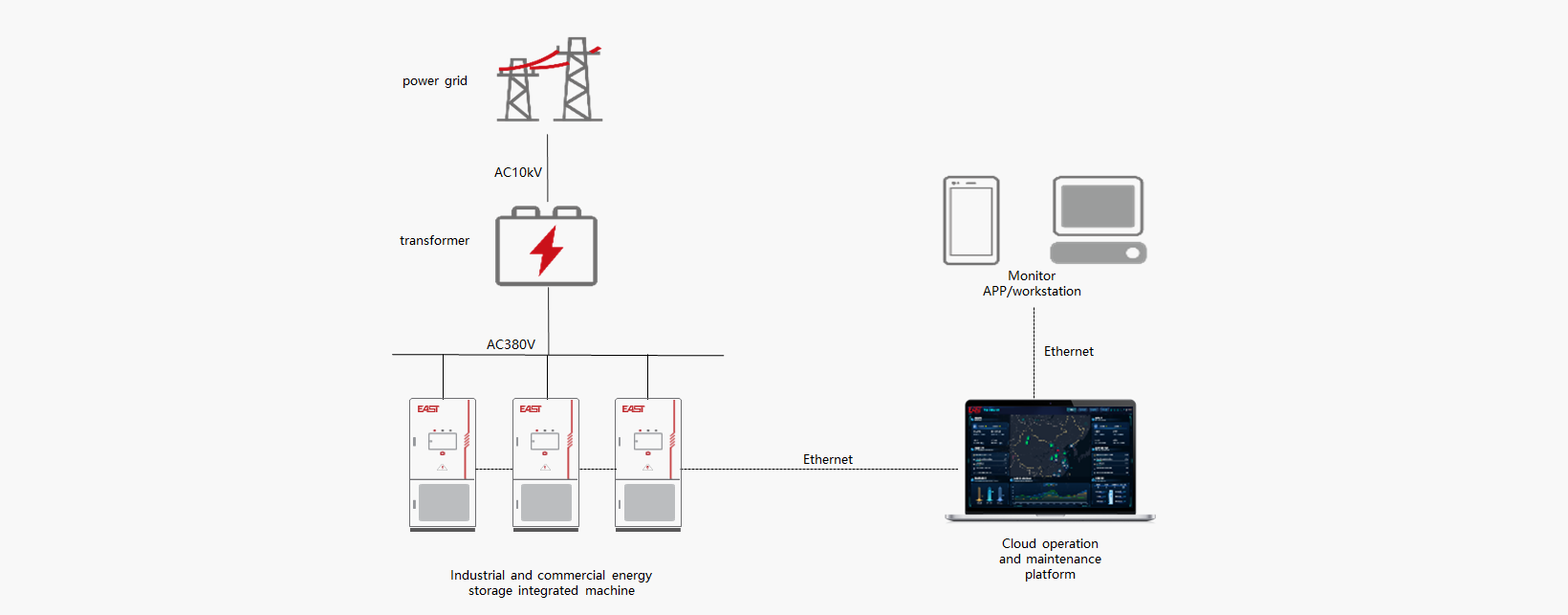 EAST C&I ESS solutions adopts modular overlapping, highly integrated integration, and easy installation; EMS remote control, AI intelligent interaction, simple management; It has multiple functions such as dynamic capacity expansion, three-phase imbalance and harmonic control, high/low voltage control, backup power, etc. It can be flexibly selected according to market demand and fully adapt to market changes.